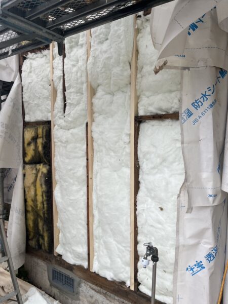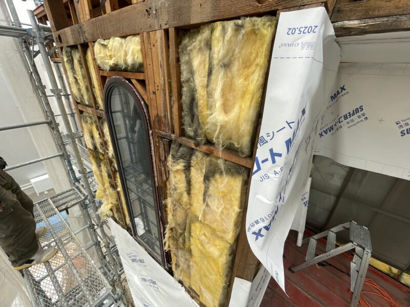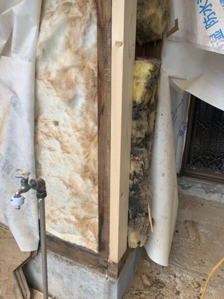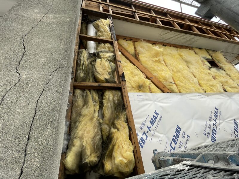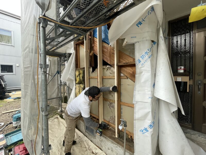 壁を剥がして断熱材の交換から始めていきます。外壁と断熱材の間に通気層が無いお家だったので内部結露も重なり柱が腐ってしまっている箇所も数カ所ありました。